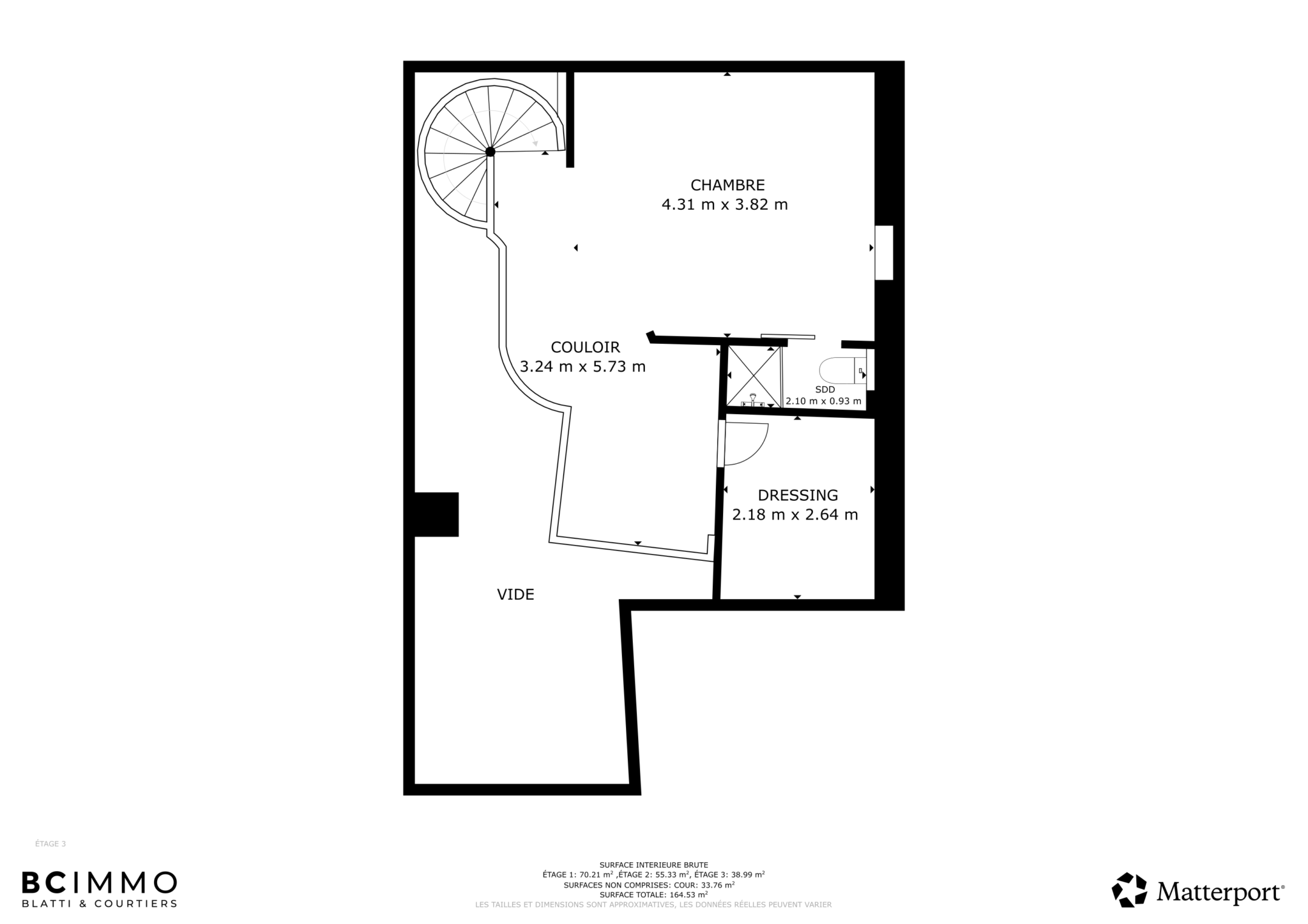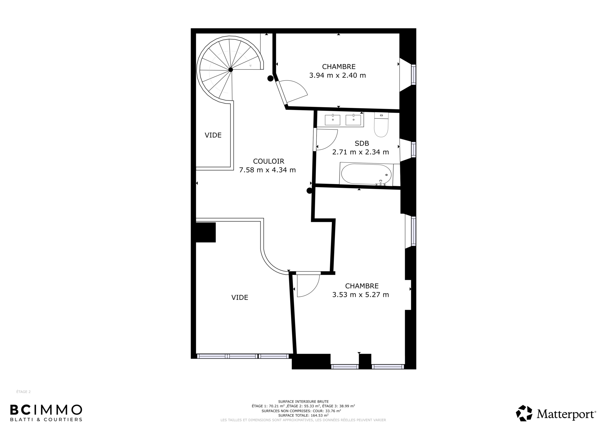 Les étages supérieurs dévoilent des pièces aux poutres apparentes et aux planchers en bois.