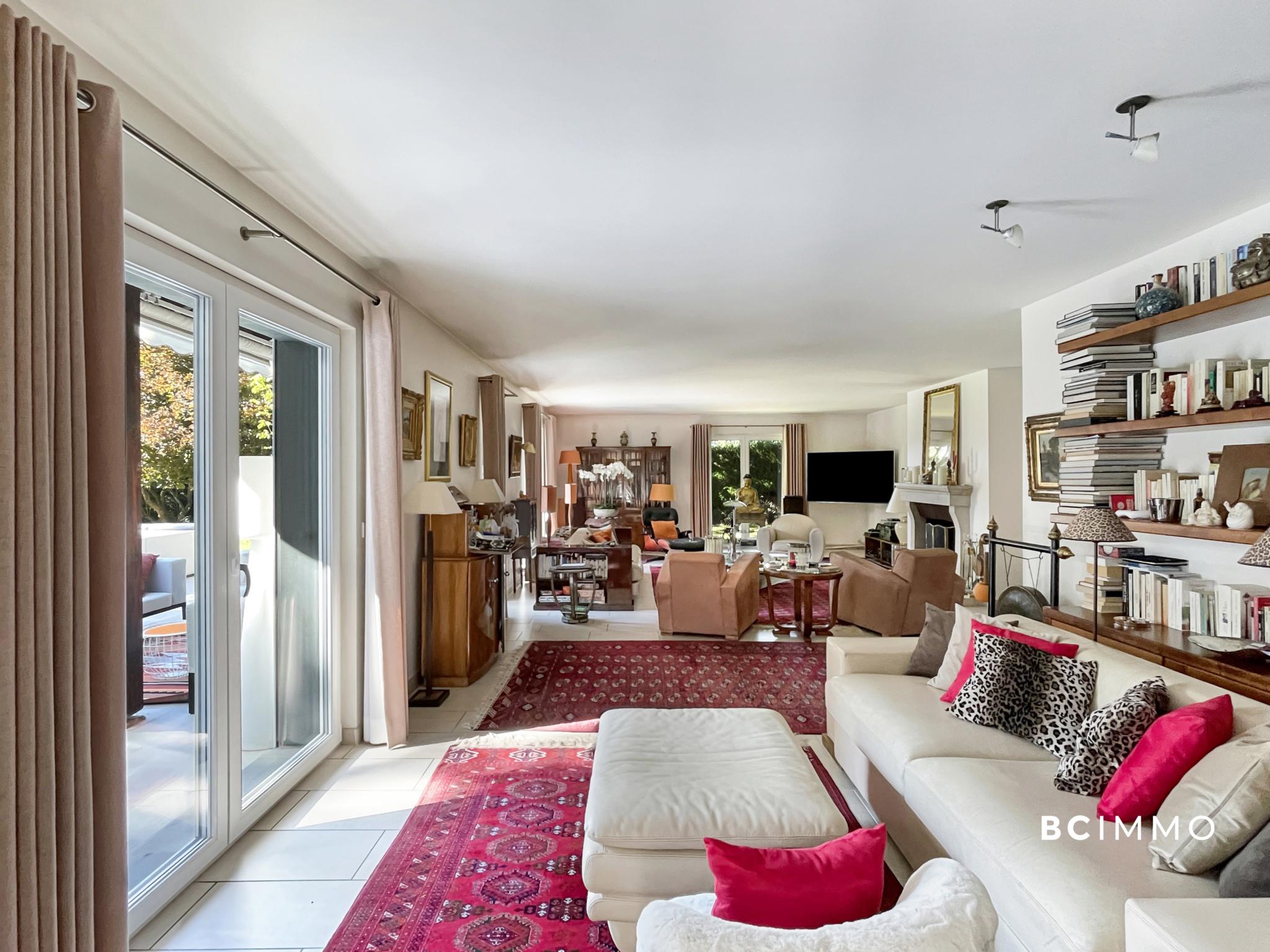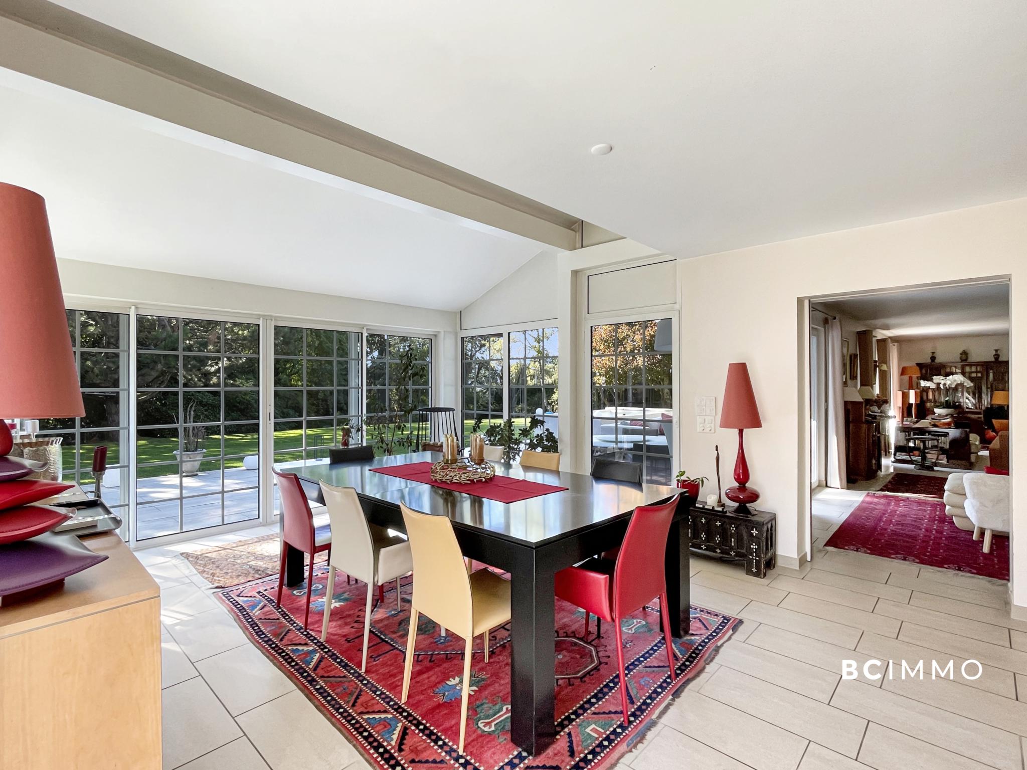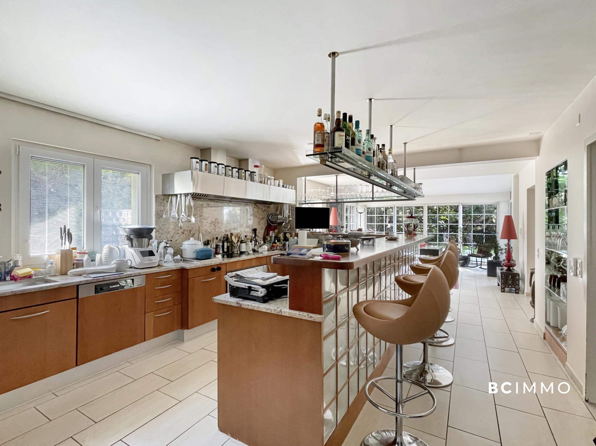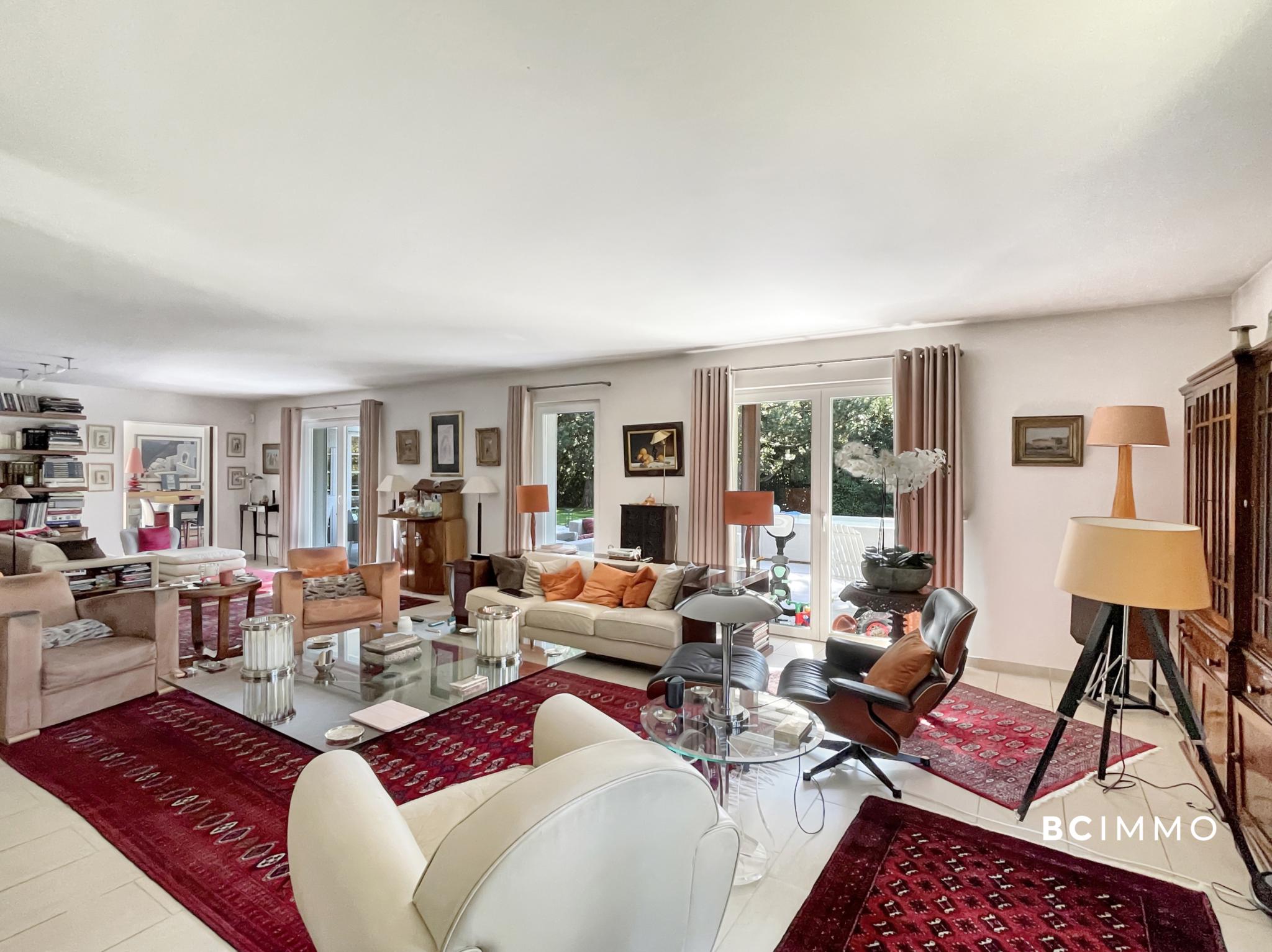 Dès l’entrée, un vaste hall agrémenté d’un escalier majestueux donne le ton. Le rez-de-chaussée accueille un spacieux séjour baigné de lumière, doté d’une cheminée et ouvert sur la terrasse ainsi que le jardin soigneusement arboré. La salle à manger attenante profite d’une belle luminosité naturelle, tandis que la grande cuisine, richement équipée et complétée d’un bar convivial, ravira les amateurs de gastronomie.