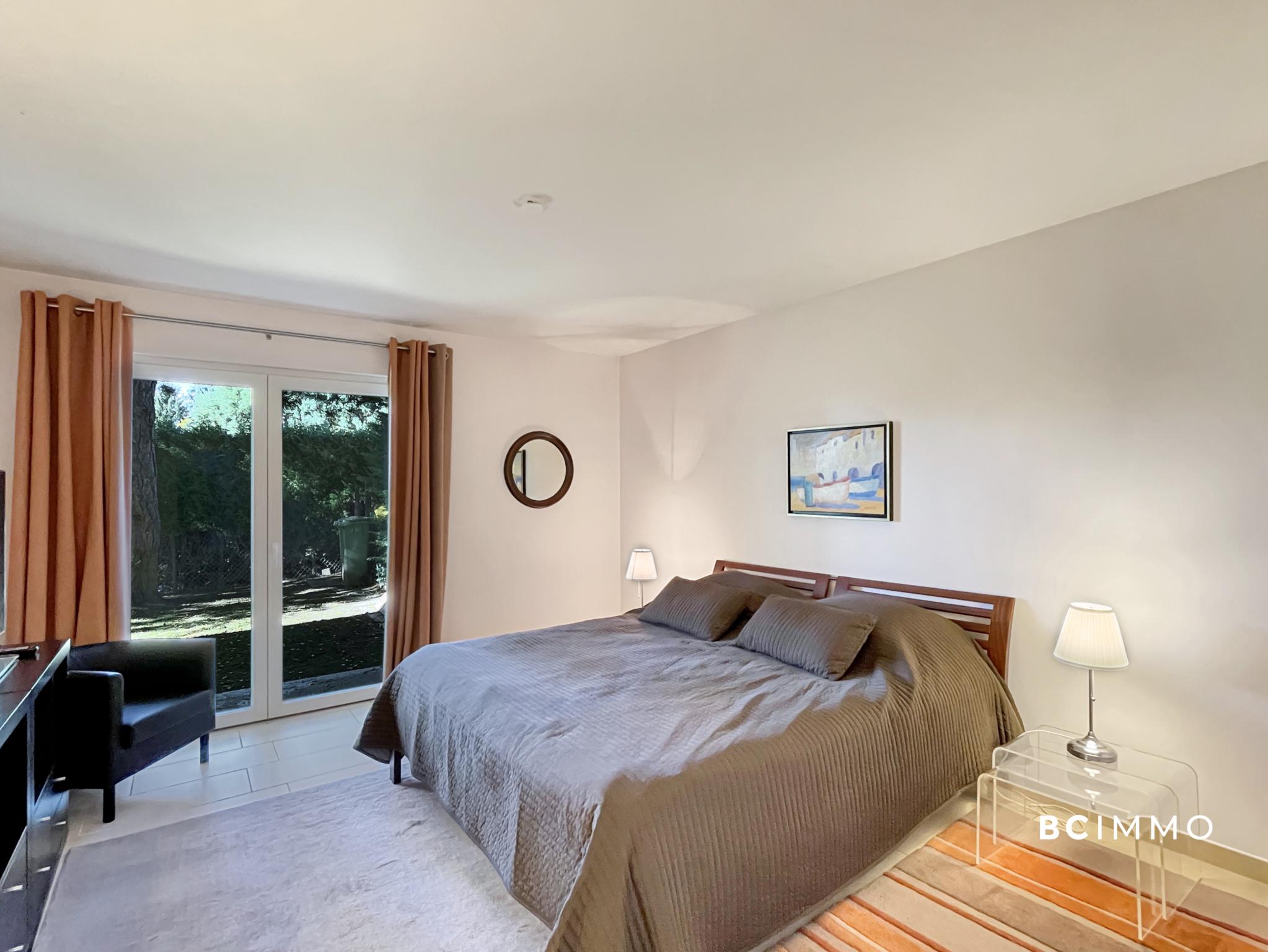 Ce niveau comprend également une suite avec accès direct au jardin, sa salle de douche et son WC, une buanderie dédiée à l’entretien de la maison ainsi qu’un garage double communiquant directement avec l’intérieur. Les extérieurs, soigneusement aménagés, offrent une vaste terrasse et un splendide jardin arboré.