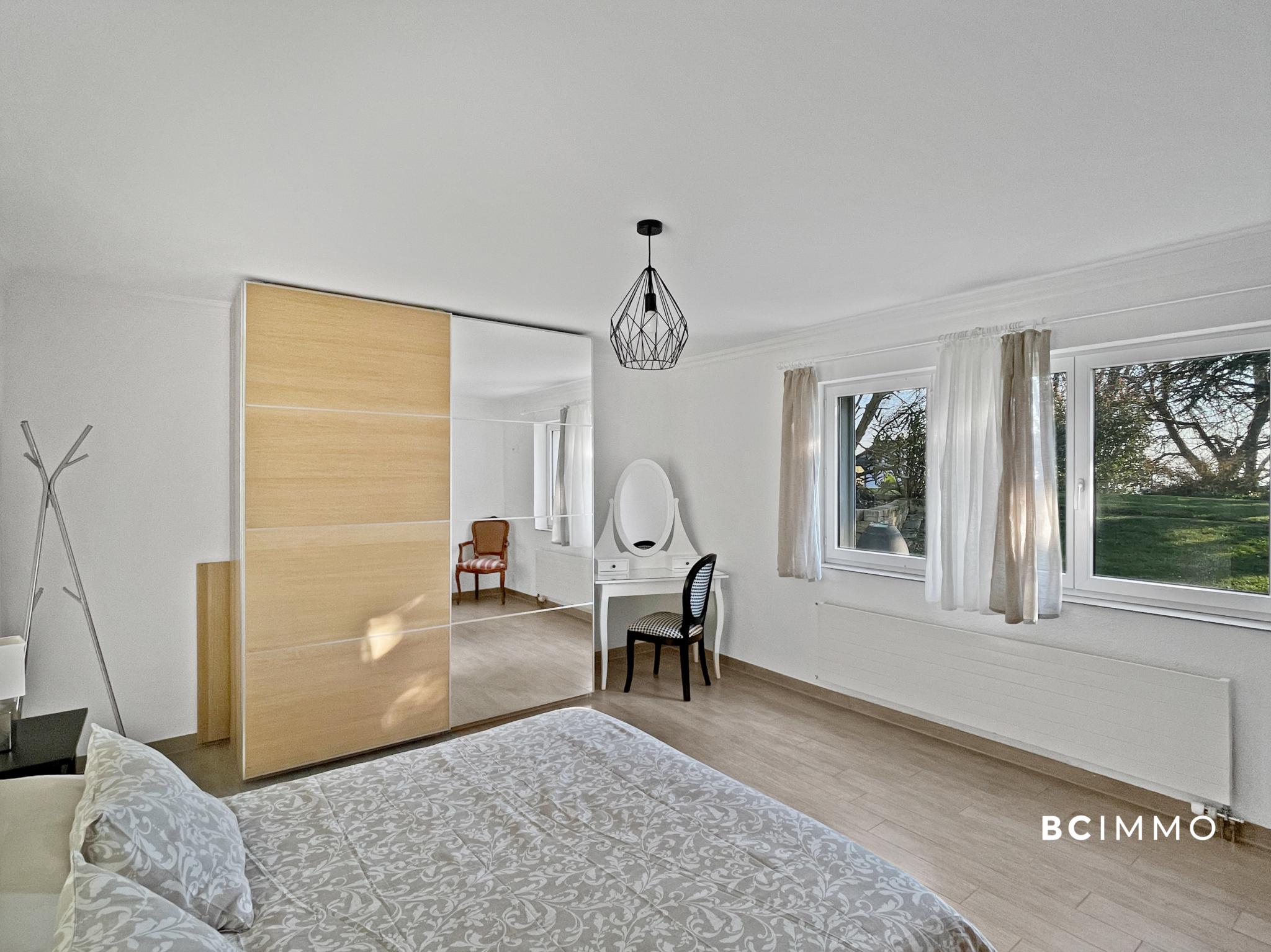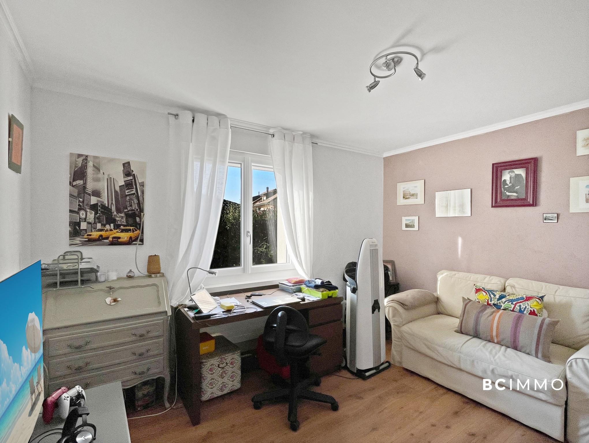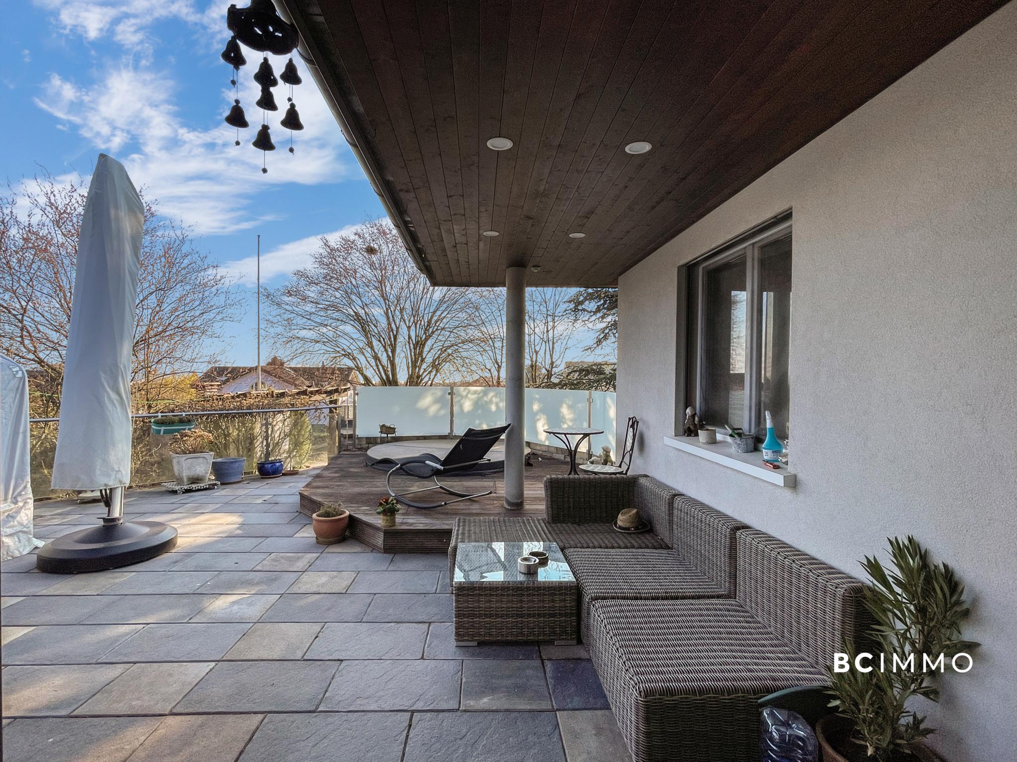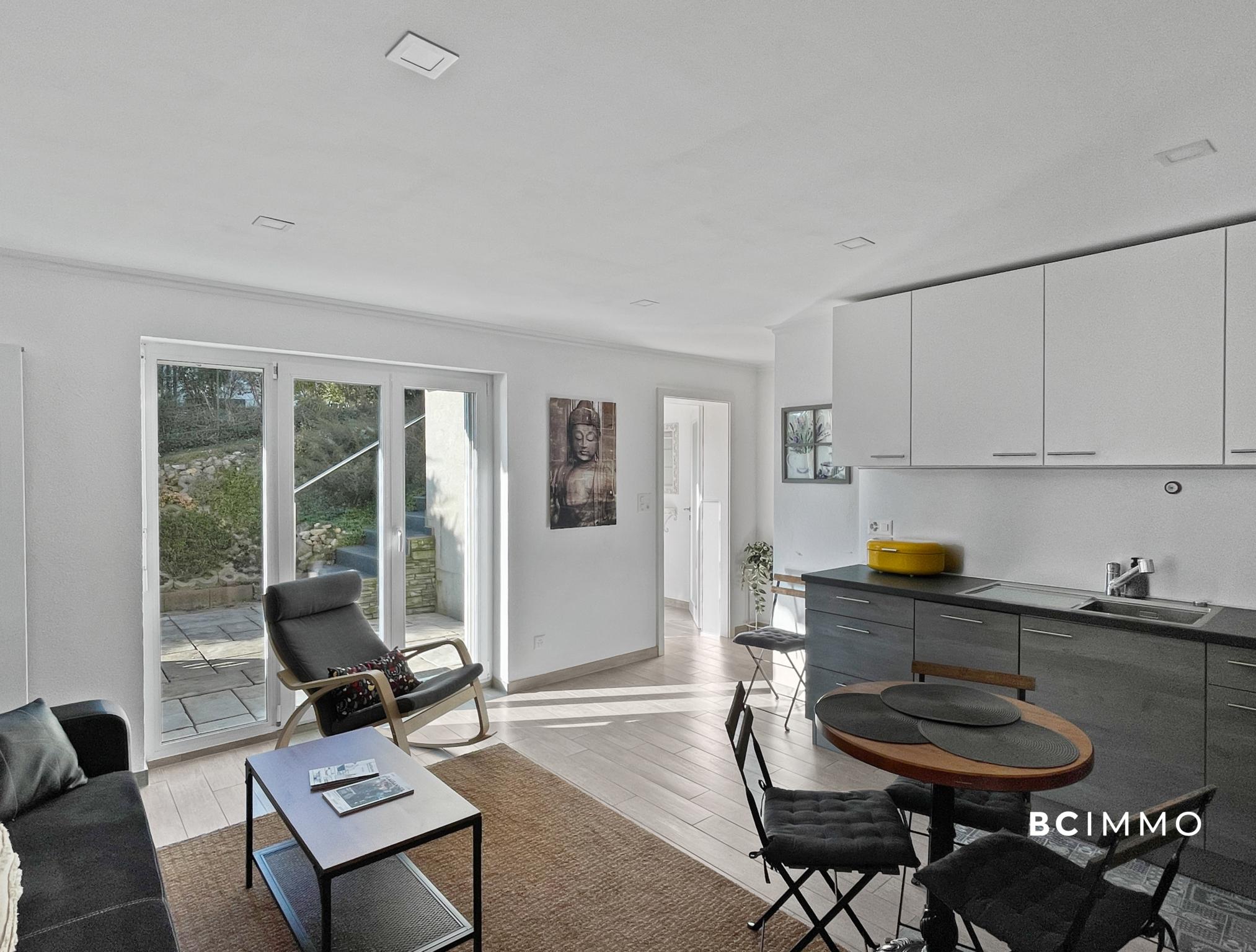 Au rez inférieur, un appartement indépendant de 2,5 pièces comprend une cuisine ouverte, une salle de douche et une chambre spacieuse ouverte sur le jardin. Cet espace peut être loué, location meublée à court terme (type Airbnb), logement pour un adolescent ou un proche, ou en espace de travail indépendant.