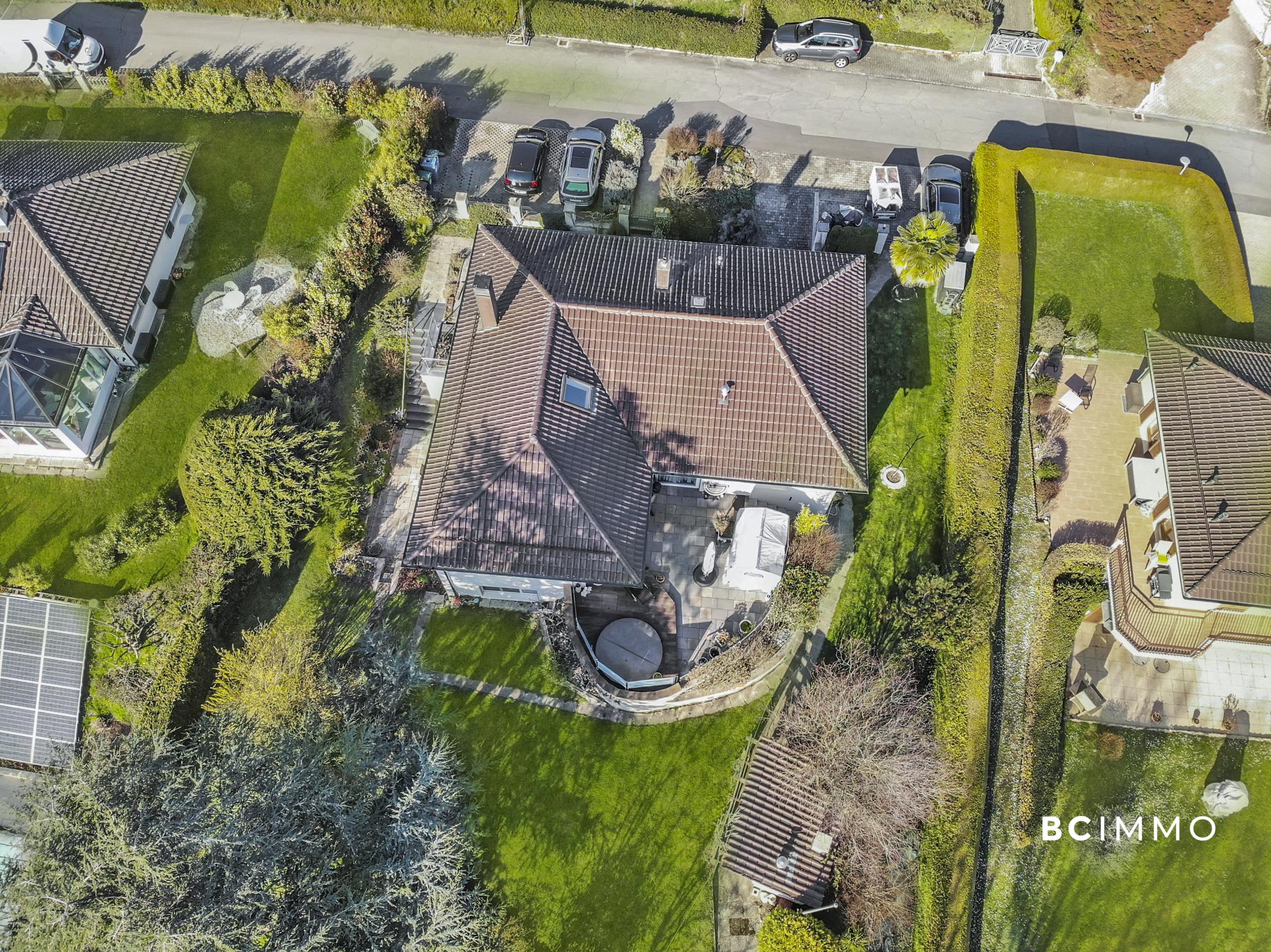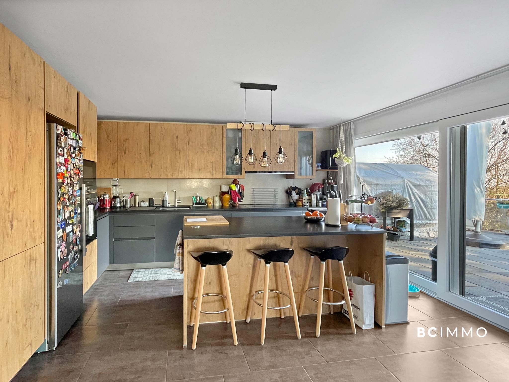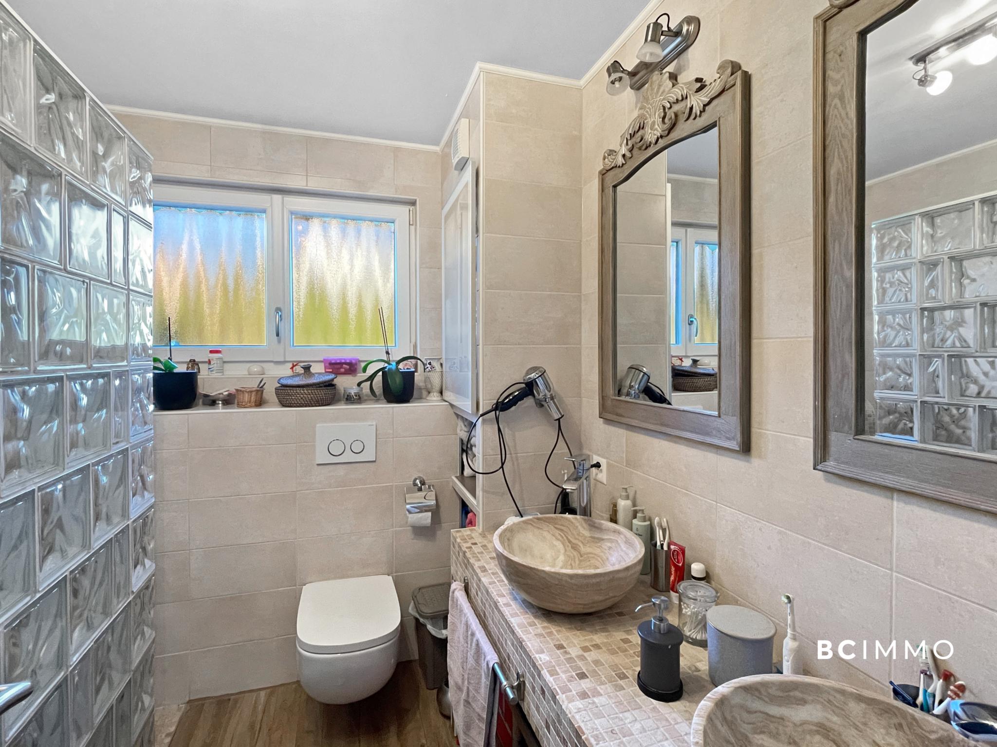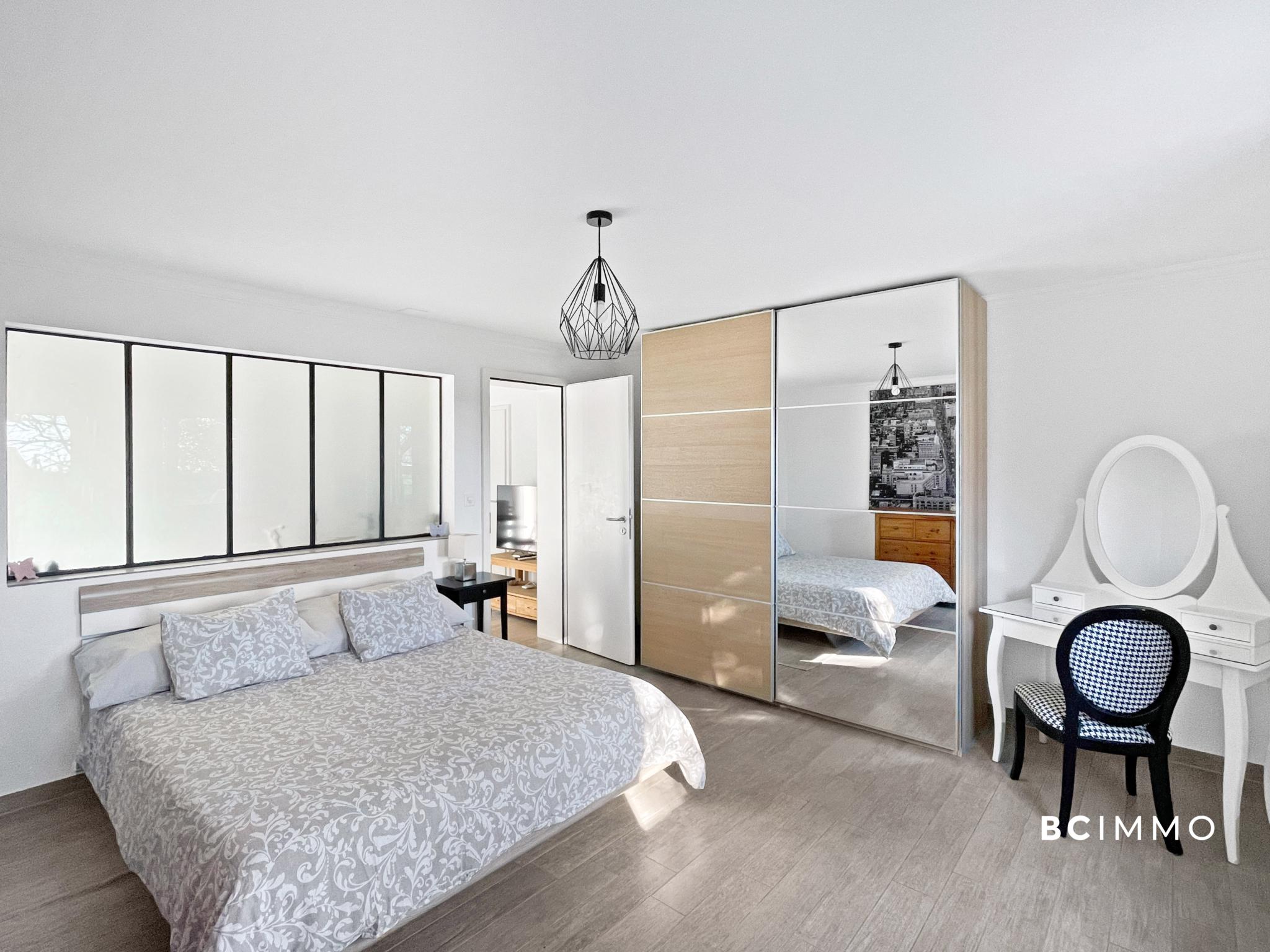 Au rez inférieur, un appartement indépendant de 2,5 pièces comprend une cuisine ouverte, une salle de douche et une chambre spacieuse ouverte sur le jardin. Cet espace peut être loué, location meublée à court terme (type Airbnb), logement pour un adolescent ou un proche, ou en espace de travail indépendant.