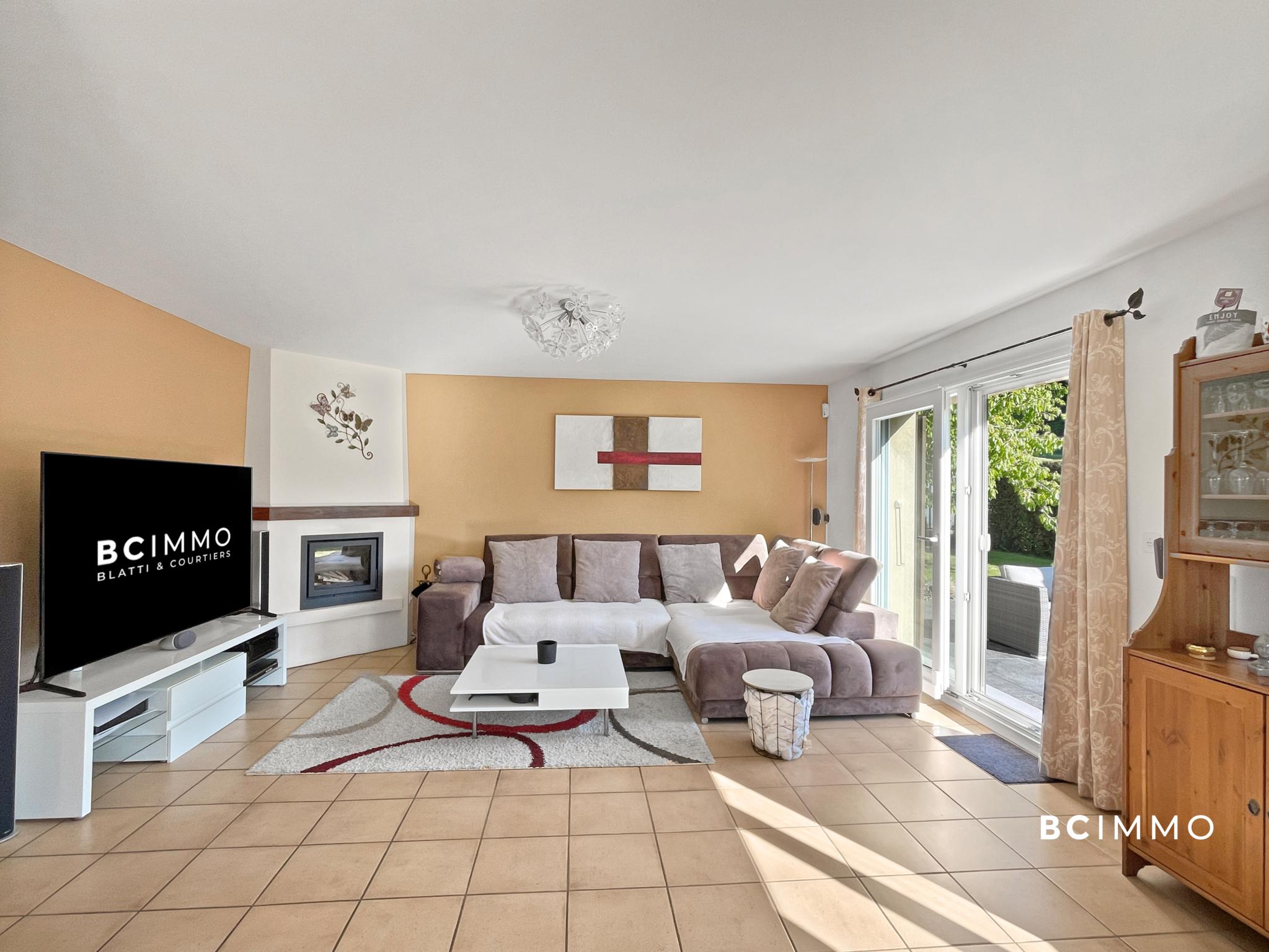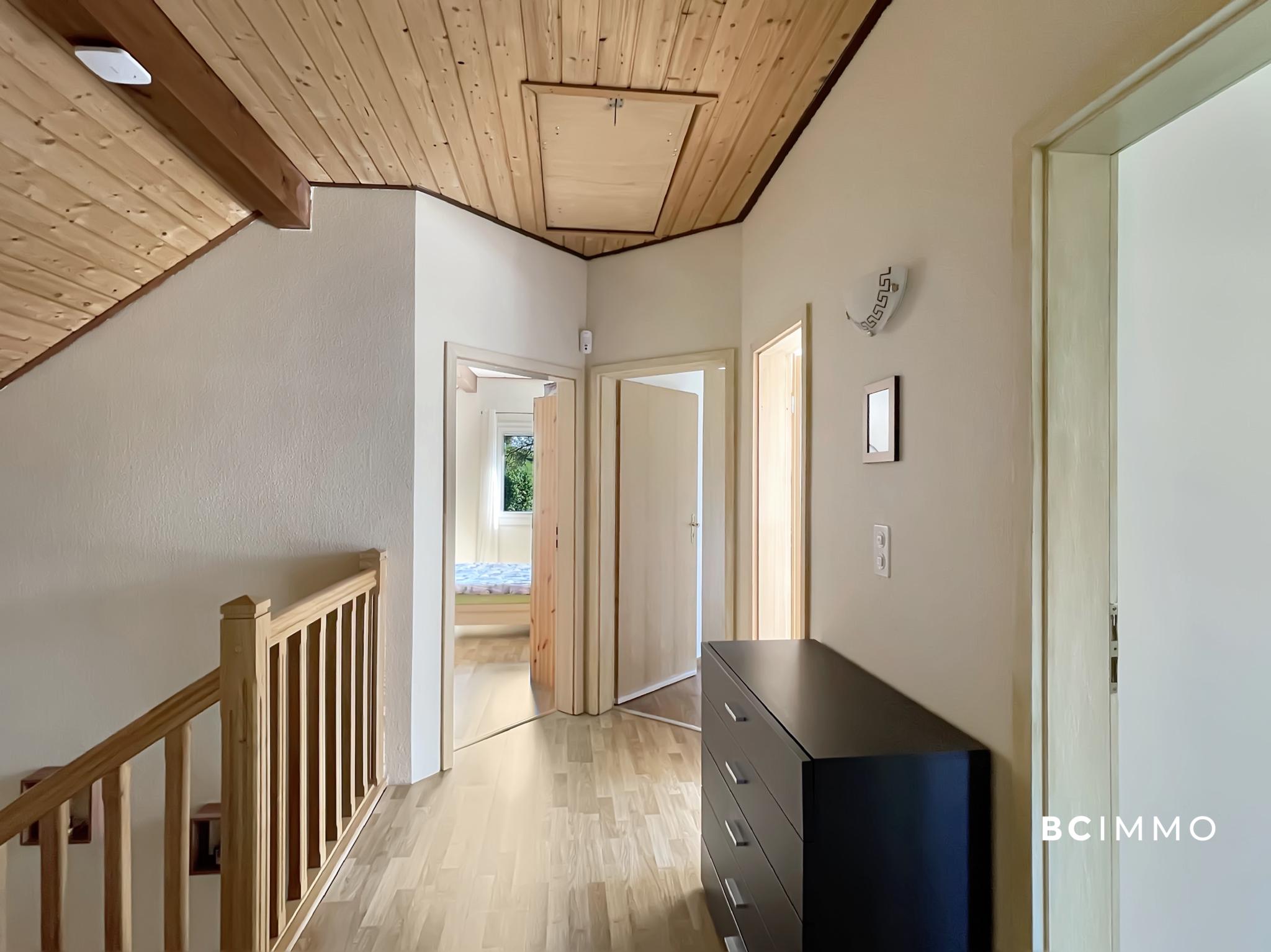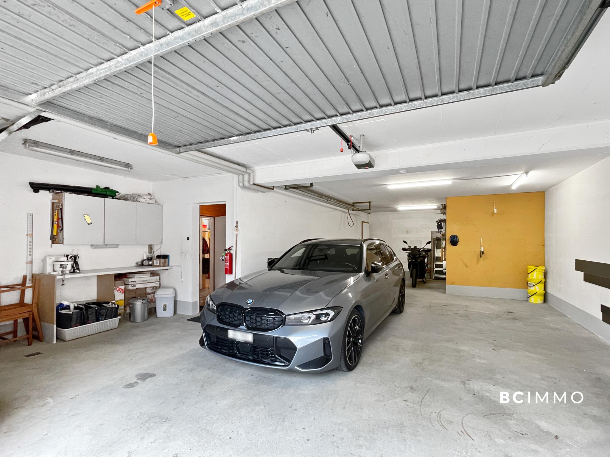 Deux terrasses orientées sud et est permettent de profiter pleinement de la lumière et de la tranquillité environnante. Le jardin, joliment arboré, s’étend autour de la maison et offre plusieurs espaces de détente. Cinq places de stationnement extérieures complètent les prestations.