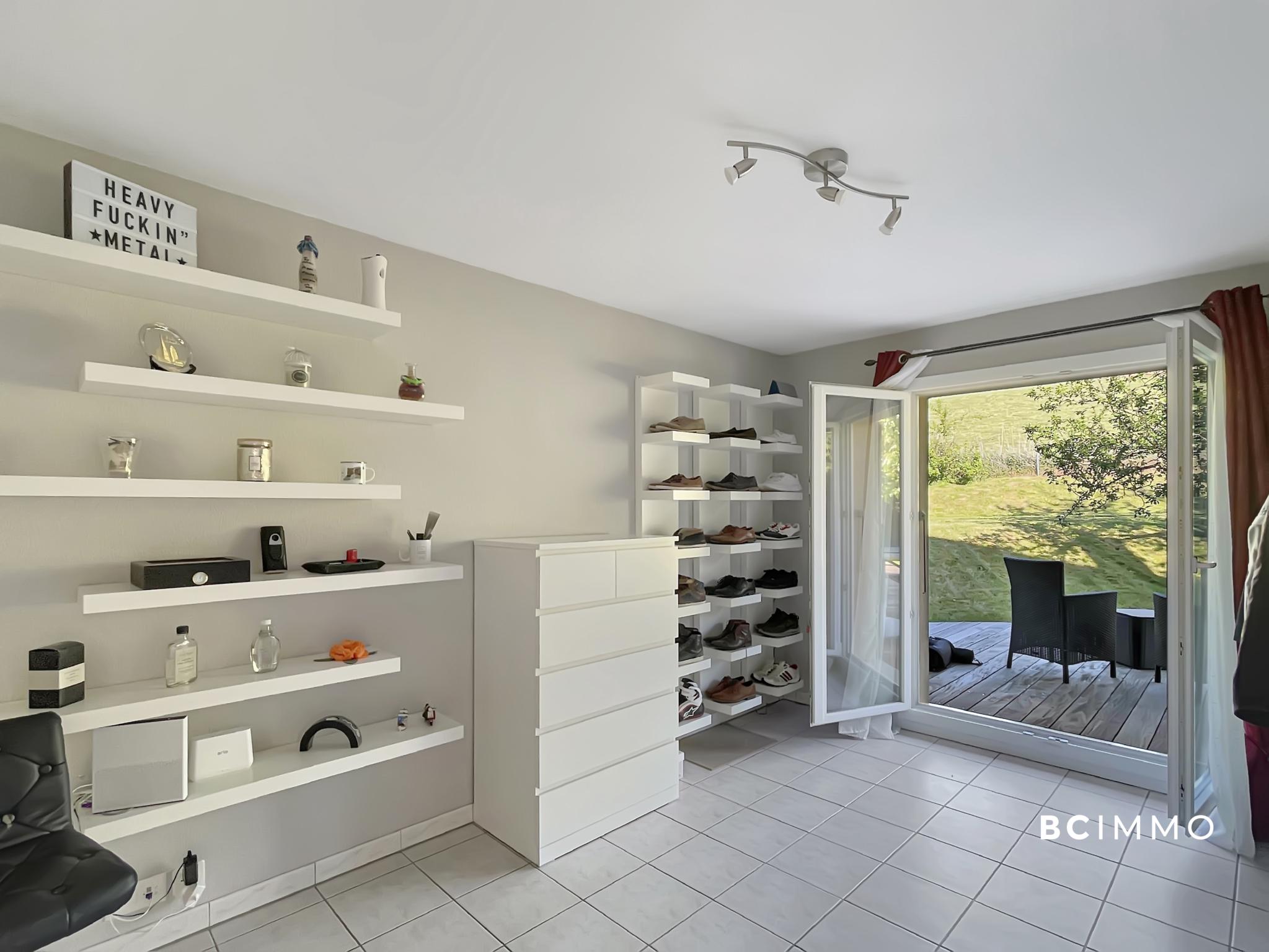 Un hall de distribution dessert une salle de douche avec wc ainsi qu’une pièce polyvalente pouvant servir de chambre, bureau ou dressing. La cuisine, moderne et très bien équipée, est dotée d’un agréable coin repas. Le séjour, lumineux et convivial, s’articule autour d’un espace salle à manger ouvert sur le salon, lui-même agrémenté d’une cheminée d’angle. De grandes baies vitrées assurent un accès direct aux terrasses et au jardin.